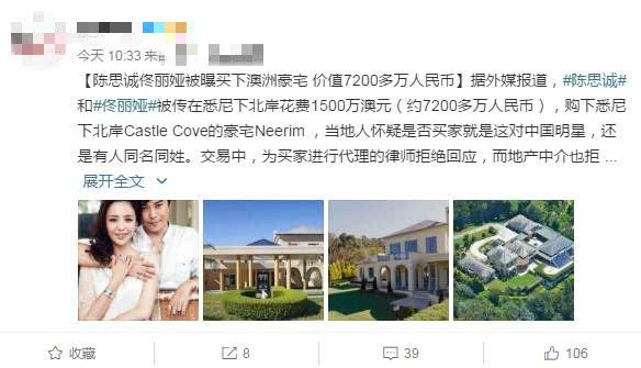 6月25日,有媒体曝光了他们在国外的豪宅,该媒体表示:“陈思诚和佟丽娅被传在悉尼下北岸,花费了大约7200多万人民币,购入了一所豪宅。虽然这条消息还没有被官方证实,为买家进行代理的律师也对此事拒绝了回应。但是当地人怀疑豪宅的新买家,就是这陈思诚和佟丽娅。