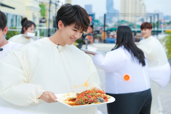 只见由于身材骤变行动不易的少年们双手托举餐具,单脚向前移动。这项游戏既要注意行进速度还要维持自身平衡,难度相当高。但一向身手敏捷的王俊凯却很快适应了游戏规则,只用一只脚依然能迅速向前移动,并眼疾手快地抢得午餐主食。