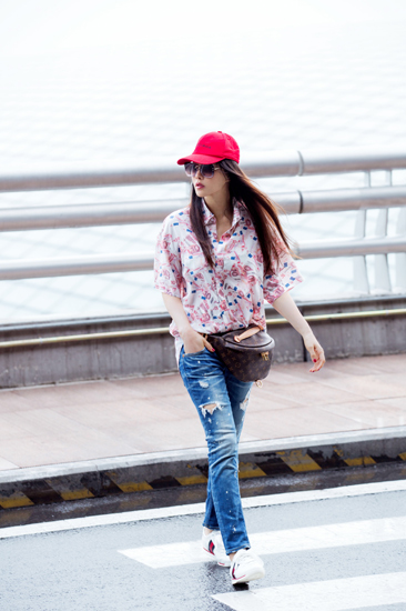 近日,伊能静现身北京首都机场,粉色衬衣搭配蓝色破洞牛仔裤搭配宛如少女,小红帽增添了几分活力...