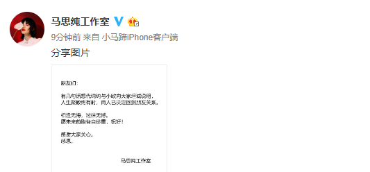 一个多小时后,马思纯也发了一条微博,并引用了安徒生的一段话:“仅仅活下去是不够的,你应该有阳光,自由和一朵可爱的小花。”并且还写了一句“愿我们冷暖自知,并且永远相信童话”。这两个人先后发的微博并没有艾特对方,没有点赞也没有互动。当时就有网友猜测俩人已分手。