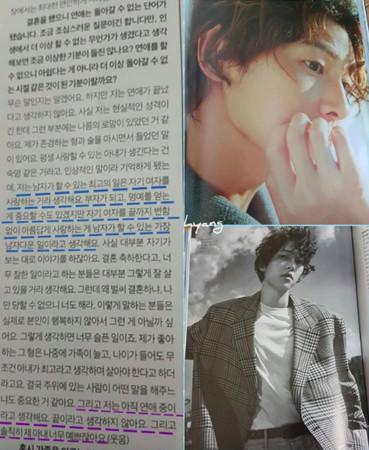 宋仲基9月担任杂志《Esquire Korea》封面人物,去年新婚的他,话题离不开爱妻,字句间都是幸福:“男人能做到的事情中,最棒的就是爱一个女人。虽然成为有钱人、得到名誉也很重要,但是能够一生爱着自己的女人不变心、美丽地相爱,这是男人能够做到的事情中最有男子气概的事情。”