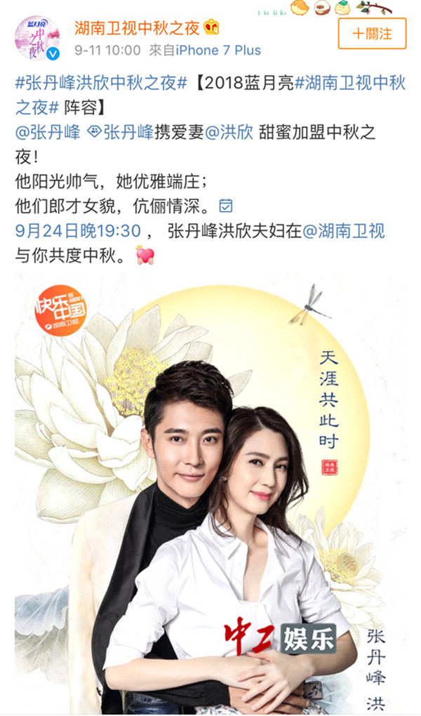 张丹峰洪欣甜蜜加盟湖南卫视中秋之夜