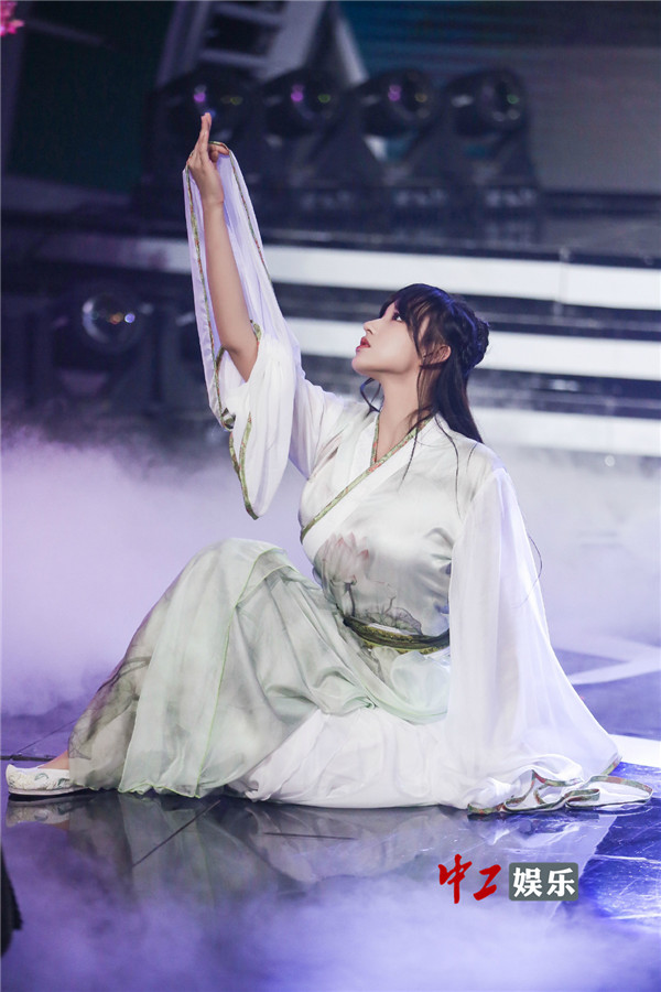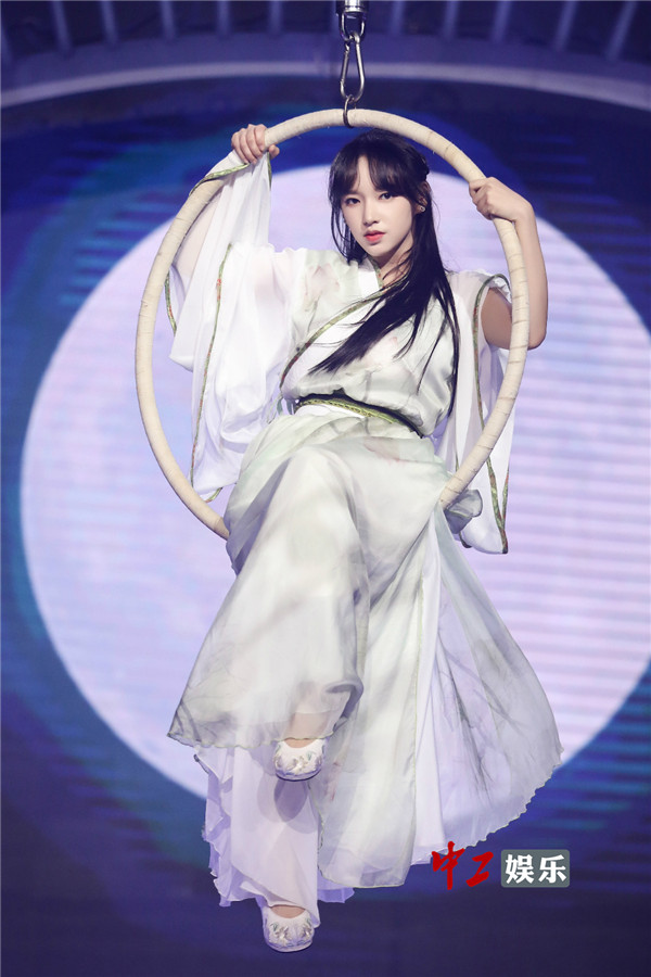 现场程潇也为观众带来了一份中秋贺礼——吊环古风舞,在歌曲《一生所爱》的伴奏下,程潇悬在半空的吊环上翩翩起舞,优雅灵动仙气爆棚,宛如“嫦娥妹妹”仙女下凡。皎洁的明月,艳丽的花朵,梦幻的仙气和蹁跹起舞的少女,十分赏心悦目,现场唯美动人飘逸缠绵,让人瞬间融入意境中难以自拔。