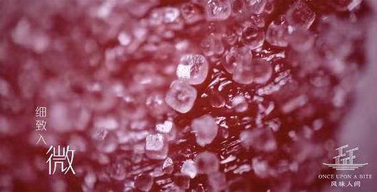 利用这些拍摄手法,我们可以看到在腌制的过程中,细小的盐粒是如何一点点渗入到肉里;也可以看到卤水与豆浆相遇后,如何凝结成豆腐。从食材间的碰撞反应,到食物在环境下的细微变化,通过微观摄影一览无余地展现在观众面前,进而思索某些味道和口感是如何产生的。
