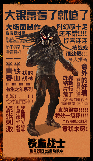 影片自从宣布引进就备受各方关注,30年经典科幻IP《铁血战士》首次登陆中国内地院线,大家都想要一睹宇宙最强猎手的风采。在上映首日接棒《碟中谍6》成为近两个月来最高开画的好莱坞大片,并且上映第一天就打破俄罗斯的总体票房记录,成为国际市场票房冠军。紧接着首周末的票房表现也可圈可点,连续获得单日票房冠军。冲着铁血战士这个影史传奇去的影迷们不计其数,这其中不乏各界明星。飞人刘翔也在微博上表达对铁血战士的喜爱之情,宣布自己将去看影片的同时也晒出自己收藏的精美手办。没想到飞人也是铁血粉!中国区最强铁粉汪东城则透露自己从小就喜欢上了这个神秘的外星猎手,被他越战越勇、无所畏惧的精神所打动。甚至说唱音乐人派克特还为影片倾情打造了中国推广曲,宇宙最强猎手铁血战士可谓影响了一代人。