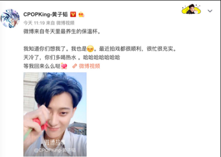 近日,领衔C-POP的超人气全能艺人黄子韬在个人社交平台晒出一段视频,配文表示“微博来自冬天里最养生的保温杯,我知道你们想我了,我也是。最近拍戏都很顺利,很忙很充实。天冷了......