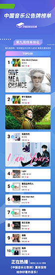 “中国音乐公告牌”榜单自公布以来,蔡徐坤、毛不易、邓紫棋、火箭少女101四组音乐人,一直位列榜单TOP10。这充分说明了他们的实力及上榜作品,受到了极高的国民认可度。第九周榜单相较于第八周变化不大,这说明目前新发音乐较少。上周榜单TOP10中,陈立农《我是你的》继续稳占榜单TOP3,火箭少女101《Light》再回第四,AWaken-F《吸引定律》重新冲回榜单前十。
