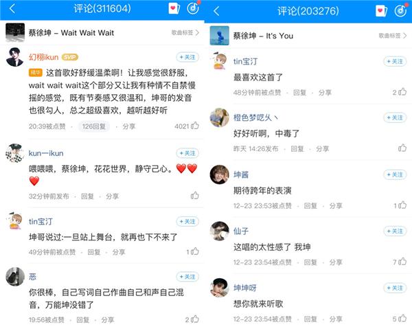 有iKun猜测坤坤会表演《WAITWAITWAIT》,因为这首歌在酷狗发布后疯狂收割了31万好评,更横扫国内外音乐榜单!也有迷妹希望看到《It’s You》的舞台,这样性感又浪漫的氛围实在太适合跨年了~
