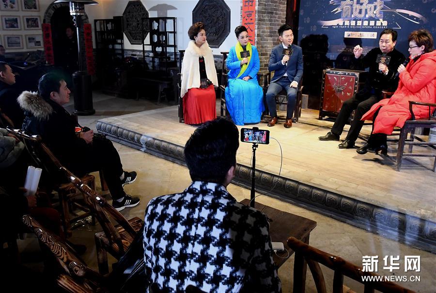 2018年12月31日,演员们在“出彩河南有好戏·2019新年网络戏曲演唱会”开始前进行网络访谈直播。新华社记者李安摄