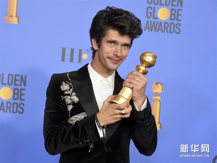 1月6日,在美国洛杉矶贝弗利山,凭借《英式丑闻》获得电视类剧情/喜剧/电视电影类最佳男配角的本·惠肖与奖杯合影。新华社/路透