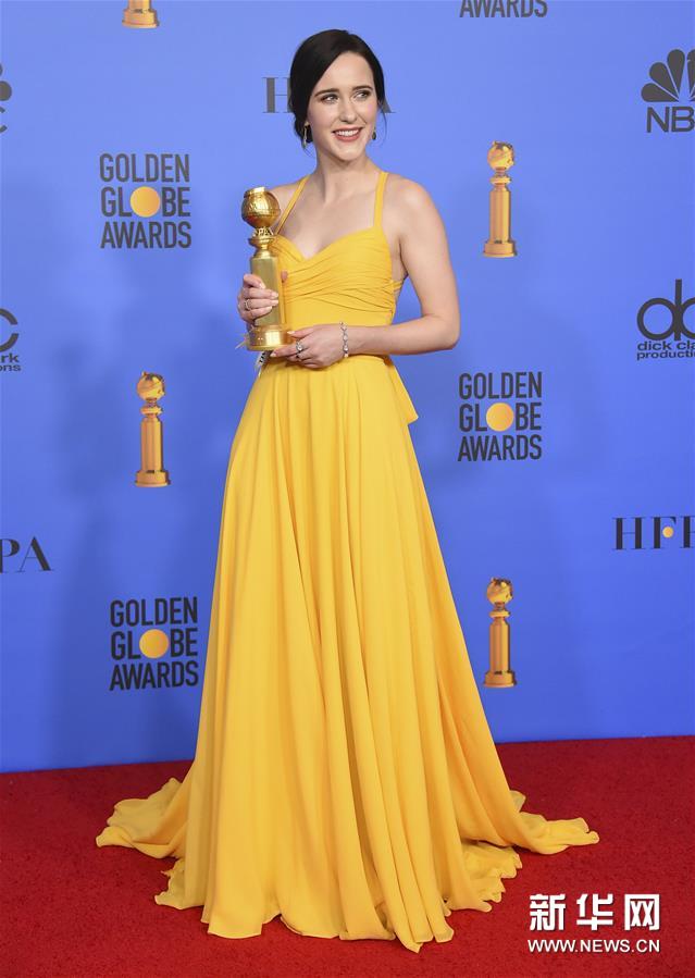 1月6日,在美国洛杉矶贝弗利山,凭借《了不起的麦瑟尔夫人》夺得音乐/喜剧类最佳女主角的蕾切尔·布罗斯纳安与奖杯合影。新华社/路透