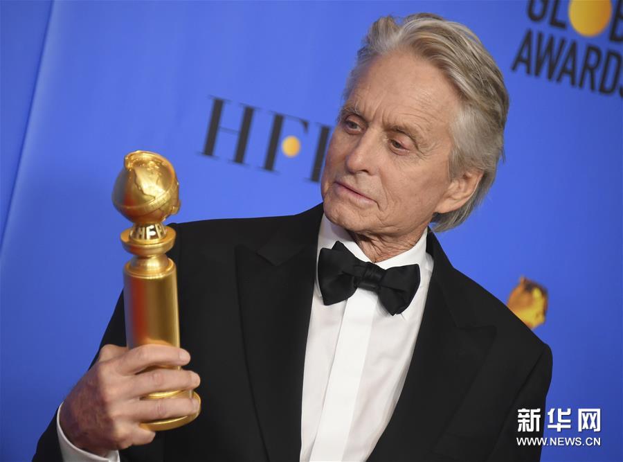 1月6日,在美国洛杉矶贝弗利山,凭借《柯明斯基理论》夺得音乐/喜剧类最佳男主角的迈克尔·道格拉斯与奖杯合影。新华社/路透