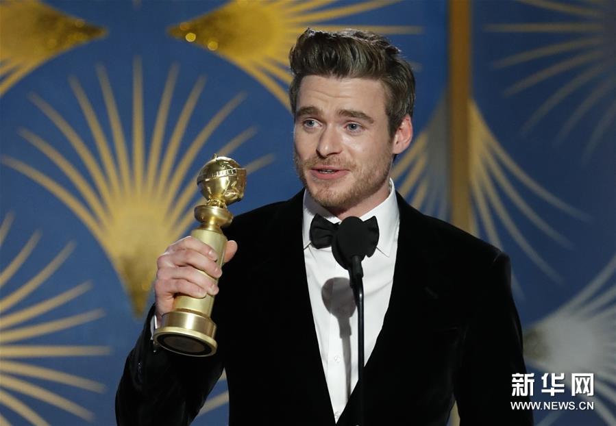 1月6日,在美国洛杉矶贝弗利山,凭借《贴身保镖》获得了电视类剧情类最佳男主角的英国男星理查德·麦登在颁奖礼上致辞。新华社/路透