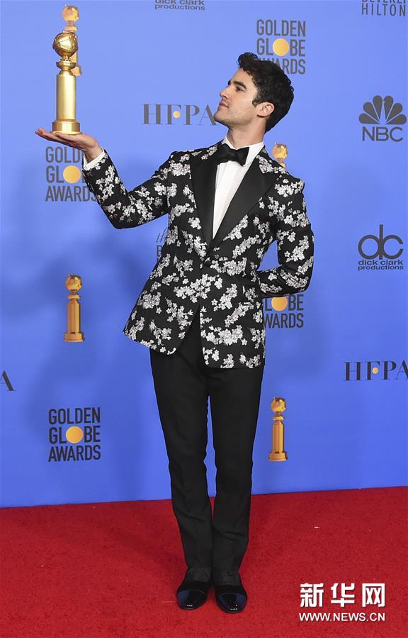 1月6日,在美国洛杉矶贝弗利山,凭借《美国犯罪故事:刺杀范思哲》获得迷你剧/电视电影最佳男主角的达伦·克里斯与奖杯合影。新华社/路透
