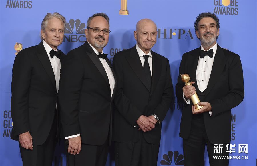 1月6日,在美国洛杉矶贝弗利山,获得音乐/喜剧类最佳剧集奖的《柯明斯基理论》主创人员与奖杯合影。新华社/路透