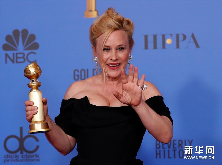 1月6日,在美国洛杉矶贝弗利山,凭借《丹尼莫拉越狱事件》获得迷你剧/电视电影最佳女主角的帕特丽夏·阿奎特与奖杯合影。新华社/路透