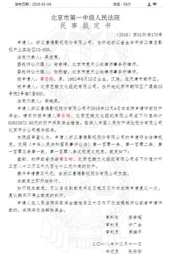 据中国裁判文书网1月4日公开的裁定书显示,2018年12月4日,浙江唐德影视股份有限公司向法院申请诉前财产保全,请求对被申请人高云翔、北京艺璇文化经纪公司名下共计6382.4万元人民币的财产采取保全措施。经北京市第一中级人民法院审查,裁定查封、扣押或者冻结高云翔、北京艺璇名下价值6382.4万元的财产,1月4日裁定申请成立。