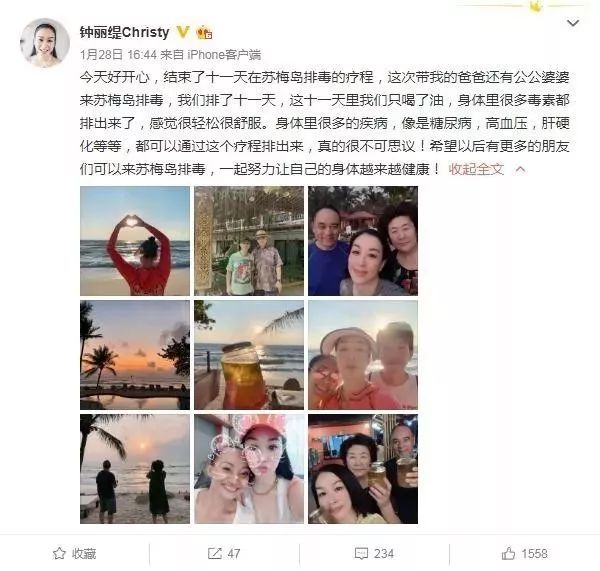 钟丽缇还说“身体里很多的疾病,像是糖尿病,高血压,肝硬化等等,都可以通过这个疗程排出来,真的很不可思议!”并且和公婆人手一瓶油,热情拉客,希望有更多人到苏梅岛排毒。