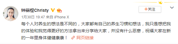 看到网友评论后,1月30日,钟丽缇留言说:“每个人对养生的想法是不同的,大家都有自己的养生习惯和想法,我只是想把我的体验和我觉得更好的方法拿出来分享给大家,并没有什么恶意,祝福大家在新的一年里身体健健康康!”