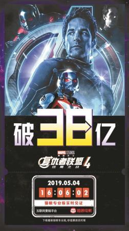 灯塔专业版数据显示,截至5月3日18点38分,《复仇者联盟4:终局之战》内地票房达36.52亿,成为内地影史第三名,头两名分别是《流浪地球》(46.56亿)和《战狼2》(56.82亿)。5月4日下午4点,票房又宣告突破38亿元。