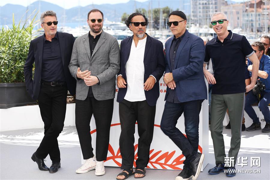 5月14日,在法国戛纳,戛纳电影节主竞赛单元评委(从左至右)波兰导演帕维乌·帕夫利科夫斯基、希腊导演约戈斯·兰西莫斯、墨西哥导演亚历杭德罗·伊尼亚里图、法国导演昂基·比拉尔和法国导演罗班·坎皮略出席拍照式。 本届戛纳国际电影节将于5月14日至25日在法国南部小城戛纳举行,共有19部影片入围主竞赛单元。执导《鸟人》和《荒野猎人》的墨西哥著名导演亚历杭德罗·伊尼亚里图出任本届电影节评委会主席。 新华社记者高静摄