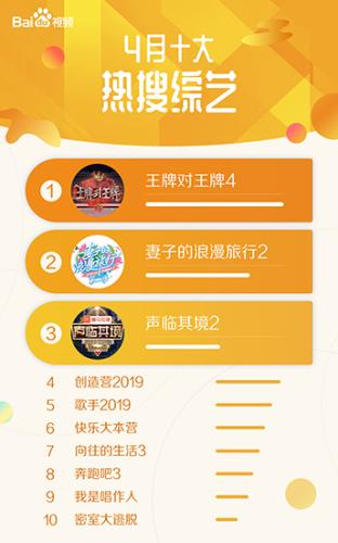 百度视频4月大数据分析显示,“综N代”继续占主流。《王牌对王牌4》兼具笑点和情怀,开播以来就频频登上热搜榜首位。《妻子的浪漫旅行2》延续了去年的热度,高居热搜榜第二,无论是张智霖袁咏仪模范夫妇的搞笑互怼日常,还是章子怡汪峰夫妇的相处点滴,都贡献了不少热搜话题。《声临其境2》、《奔跑吧3》、《歌手2019》等老牌综艺节目也都表现不错。