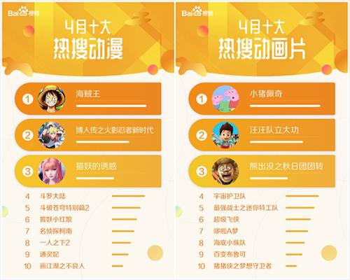 4月动画片热搜榜总体变化不大,《小猪佩奇》、《汪汪队立大功》、《熊出没之秋日团团转》依然是小朋友们最爱看的3部动画片。榜单中其它作品也都是近两年完结的动画片。可以看出,经典动画片生命力强劲,经久不衰,同时,动画片市场的剧本创新、技术创新等方面仍存在很大的空间。