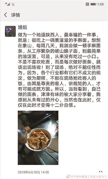 娟姐还在她发的第一篇微博,教授怎么做油泼面的文章中,回忆了一下来剧组的故事。《长安十二时辰》是她第一次接触到剧组,此前的剧组对她而言,像是个神秘的星球,因此进组后她忐忑不安,担心大家能否吃得惯,担心自己能否融入到这个圈子,而进组后,娟姐做的第一顿饭就是做油泼面,而且还是在现场做的。