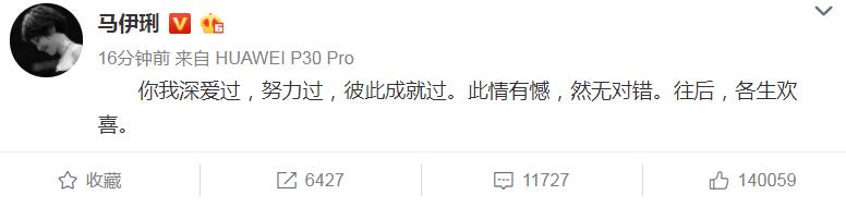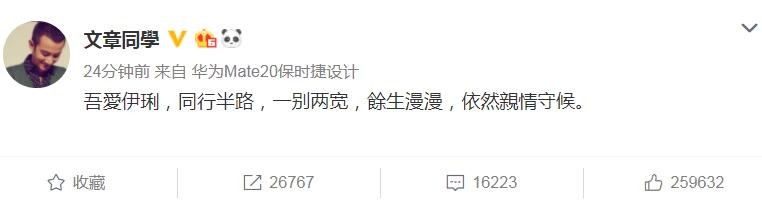 7月28日下午,文章发文宣布离婚,“吾爱伊琍,同行半路,一别两宽,余生漫漫,依然亲情守候”,马伊琍也发文。