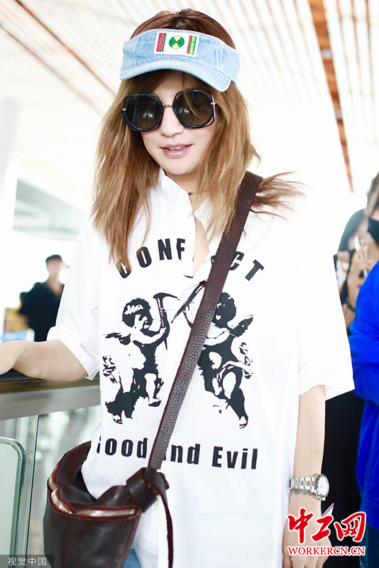 2019年9月15日,赵薇现身机场,从北京飞往上海。她头戴遮阳帽穿白色上衣和牛仔裤元气满满,用嘴巴咬手指可爱十足超呆萌。