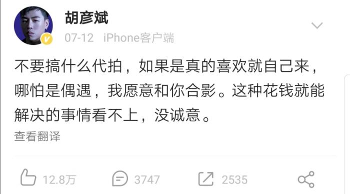 今年7月,胡彦斌微博发文表示:“不要搞什么代拍,如果是真的喜欢就自己来,哪怕是偶遇,我愿意和你合影。这种花钱就能解决的事情看不上,没诚意。”
