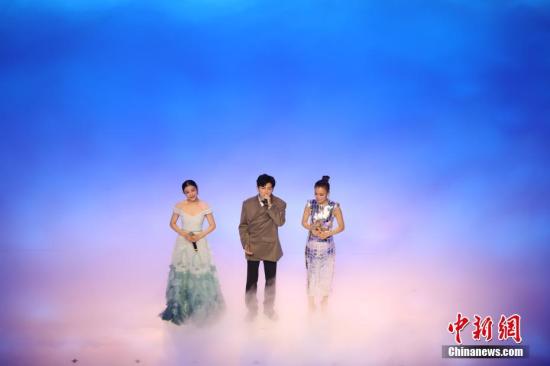 11月19日晚,第28届金鸡百花电影节在福建厦门开幕。图为苏有朋(中)、容祖儿(右)和喻越越(左)合唱《鼓浪屿之波》。中新社记者 李思源 摄