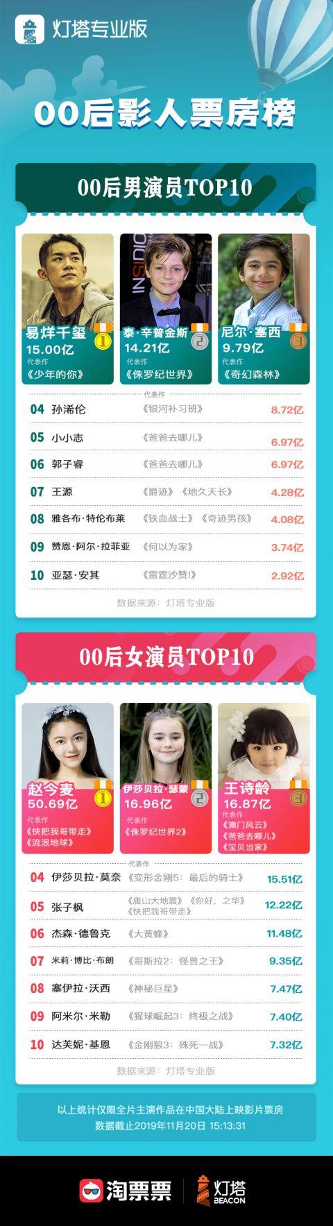 11月20日,阿里影业旗下灯塔专业版发布00后影人票房榜,男演员榜中,易烊千玺凭借《少年的你》中的惊艳演技,以15亿票房的成绩荣登00后男演员票房榜首。而女演员榜中,赵今麦则凭借春节档冠军《流浪地球》及《快把我哥带走》等优质影片摘得00后女演员票房榜桂冠。