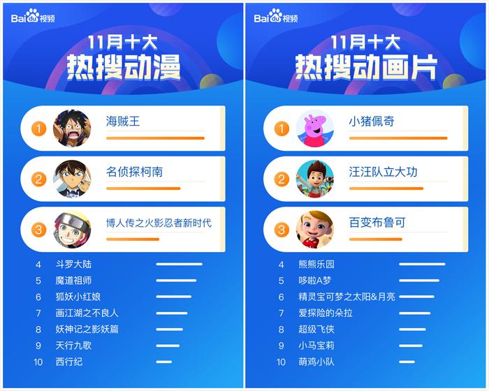 11月,日漫《海贼王》、《名侦探柯南》、《博人传之火影忍者新时代》依然占据了热搜榜前三名。不过热搜榜后七名均被国漫包揽,《斗罗大陆》、《魔道祖师》、《狐妖小红娘》、《画江湖之不良人》、《妖神记之影妖篇》等经典国漫热度长期居高不下,新作品继续缺席。