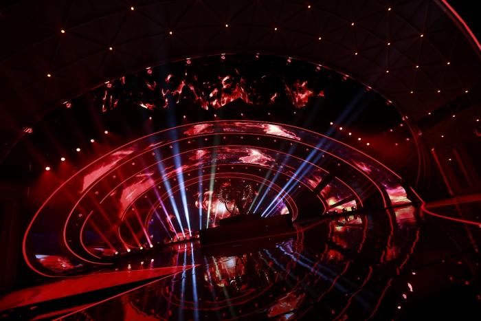 今年,湖南卫视春晚的主视觉在年节氛围中融入“赛博朋克”,在延续 “中国风”的舞美设计上,对视听运用进行全面升级。半椭圆形的主舞台,加之独具匠心的屏幕设计,多个可变色屏幕构建出极具纵深感与立体感的空间。