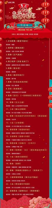 从曝光的节目单来看,今年的山东春晚不管是歌舞类节目还是语言类节目,都有众多实力派担纲。李宇春、黄渤、黄晓明、黄子韬、腾格尔、龚琳娜、马天宇等实力演员,冯巩、宋小宝、王小利、孙涛等喜剧演员,和众多演艺人员、祖国的劳动模范、先进建设者们欢聚一堂,带来一场欢庆热烈、温暖有爱的大联欢。