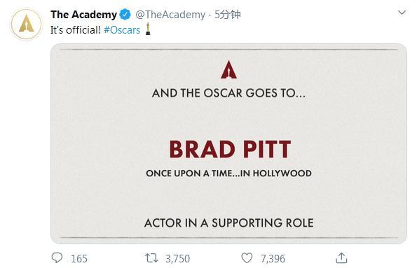 奥斯卡首个奖项公布 布拉德·皮特获最佳男配奖