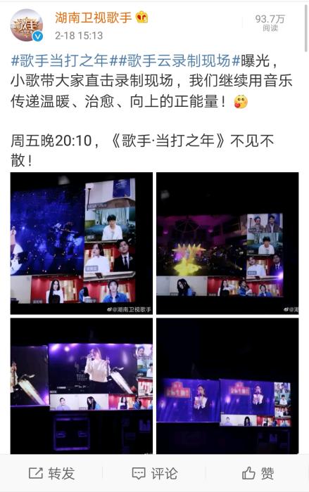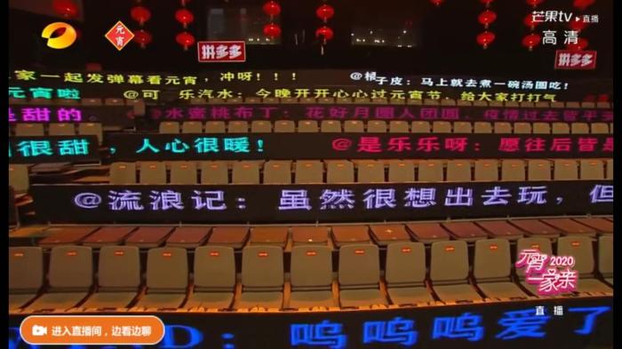 早在元宵节时,央视就将元宵晚会改为“抗击疫情特别节目”,并首次取消现场观众。湖南卫视、江苏卫视、东方卫视等的元宵晚会也都未设观众席,并采取云录制、云直播等方式录制。其中,湖南卫视将观众席改造为弹幕式观众席,网友的评论投映在一排排的座位上,这一暖心创意曾引发众多网友点赞。