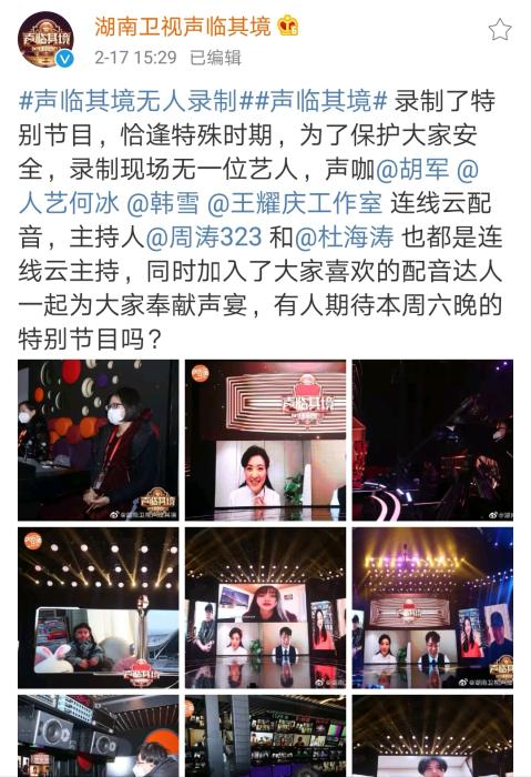 《声临其境》也开启云配音模式,胡军、何冰、韩雪、王耀庆等在家中和杜海涛连线完成配音,节目还紧跟网友心声,请来了网红配音团队淮秀帮加盟。