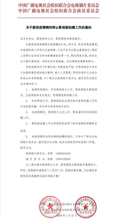 中国广播电视社会组织联合会电视制片委员会与中国广播电视社会组织联合会演员委员会1月31日发布通知,要求疫情防控期间,所有影视制片公司、影视剧组及影视演员,应按照国家有关规定,暂停影视剧拍摄工作。
