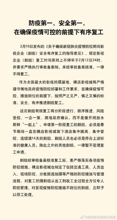而此前,2月10日,横店影视城发布复工指导意见,规定影视企业(剧组)复工时间原则上不得早于2月12日24时,需经过审批、备案,否则不得擅自复工。复工将分阶段推进:第一阶段复工从2月13日开始,影视企业(剧组)员工春节期间均在本地且未接触疫情严重地区人员的,经审核通过后优先予以复工。目前仍在疫情严重地区的人员,要劝导暂缓返回。对发现疫情防控措施不到位的剧组,立即予以停工处理。
