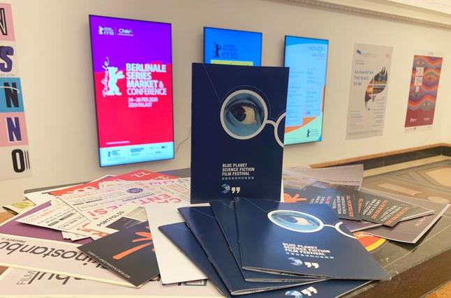 第70届柏林国际电影节于2月20日至3月1日在柏林举行。受疫情影响,“蓝星球科幻电影周”取消了原定在柏林电影节欧洲电影市场的推介活动。图为在电影节场地里展示的推介资料。(新华网发,王薇摄)