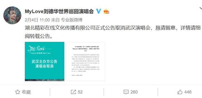 2月4日,My Love刘德华世界巡回演唱会武汉站宣布取消。