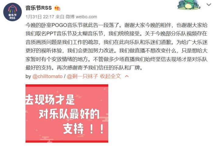 1月30日,音乐资讯平台“音乐节RSS”发起“卧室pogo音乐节”,播放乐队过往的演出视频,“想给大家暂时有个安放情绪的地方。”