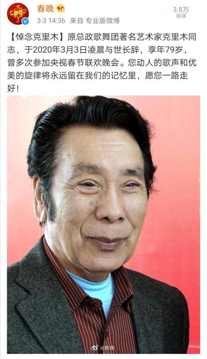 中新网客户端北京3月3日电(记者 宋宇晟)2020年3月3日凌晨,著名歌唱家克里木与世长辞,享年79岁。