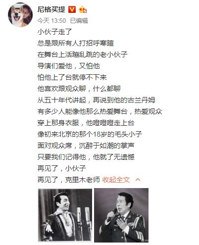 央视主持人尼格买提3日通过微博悼念。他回忆,克里木“喜欢跟观众聊,什么都聊,从五十年代讲起,再说到他的古兰丹姆”。尼格买提还写道:“只要我们记得他,他就了无遗憾……再见了,克里木老师。”
