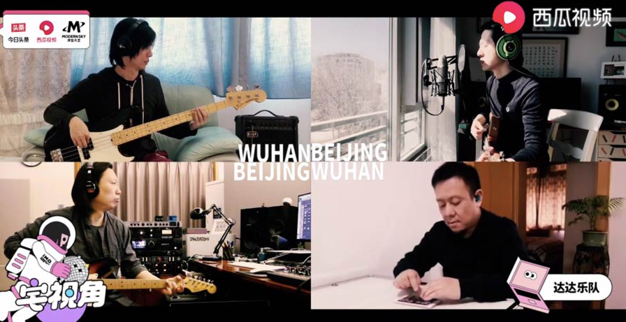 达达乐队隔空相聚,北京武汉异地同屏演唱《南方》。摩登天空 供图