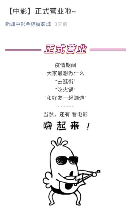 3月16日,新疆中影金棕榈影城重新开始营业,率先吹响了电影院复工的号角。新疆的多家电影院也成为疫情后复工的第一批影院。