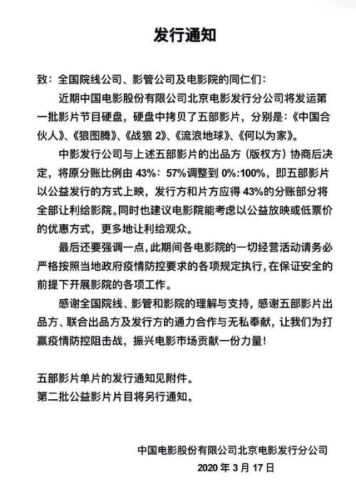 近日,中国电影股份有限公司的发行通知中也透露,中影将向全国院线发送第一批复映影片,包括《中国合伙人》《狼图腾》《战狼2》《流浪地球》《何以为家》。这五部影片将以公益发行的方式上映,所有放映收入归影院。同时中影也建议影院以公益放映或低票价的优惠方式让利给观众。