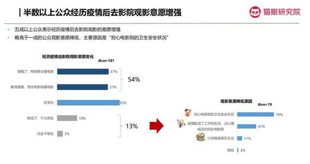 另一方面,观众观影的意愿也在增强。猫眼研究院的一项调研显示,近七成观众选择在疫情结束之后“聚餐吃饭”和“去电影院看电影”。半数以上观众在经历疫情后影院观影的意愿增强,27%的观众表示“特别想去看电影”。